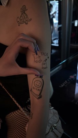 お暇な日は最近surumeちゃんの 腕にお絵描きするのに ハマってます🎨✍💕 タトゥー1個1個可愛い系だから、 ローリーの絵も書き足したくなっちゃう🥺💖 意外と、描いた後みんなに見てもらっても 分からない笑 前はしお味のおにぎりくん 今回はたこさんウィンナー surumeちゃんのご希望で いれさせていただきました💖 かわちい! ちな、片手ハートはエフさん 仲良しこよしのばにーお届けでした💖 本日21じ〜❣️